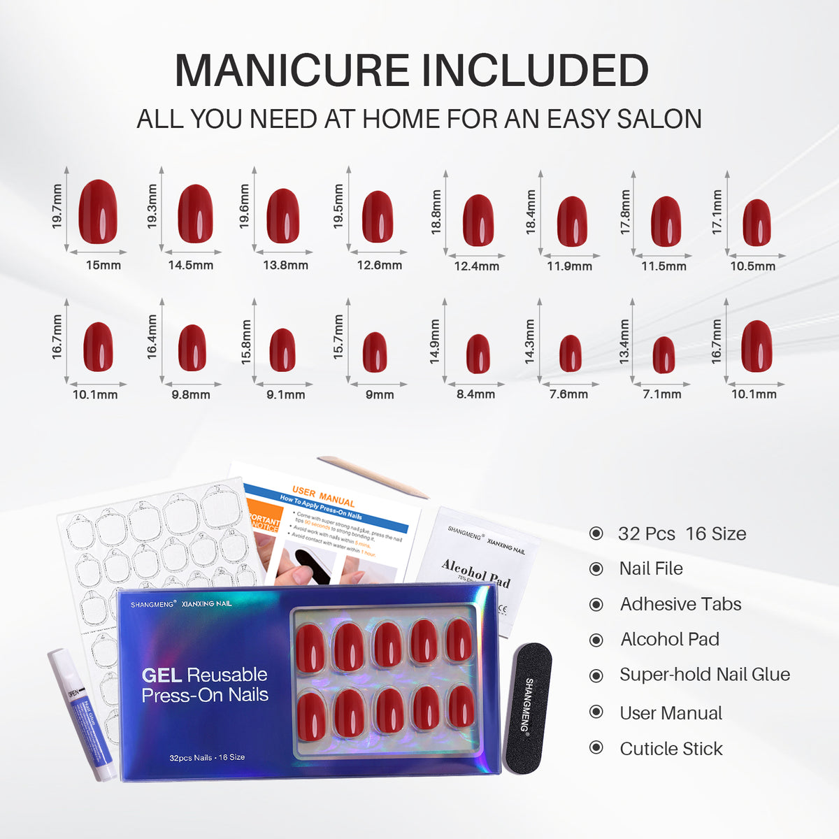 • 32 Gel Nails (16 inclusive sizes, 32 pieces)