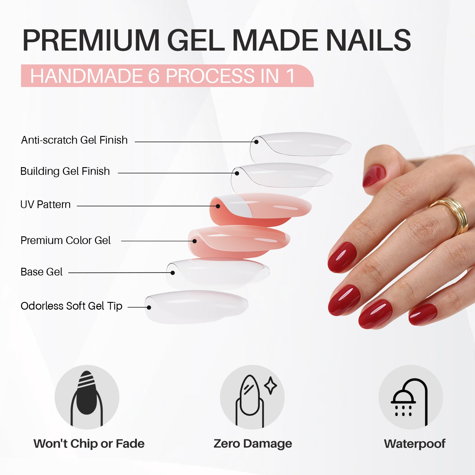 Made by Soft Gel: SHANGMENG®Nail created these acrylic press on nails entirely through a handmade 6-layer process (soft gel tip, base gel, color gel, pattern, double-layer gel finish). The colors and patterns are made with gel polish instead of being printed with ink. You can get our salon-like nails in 5 minutes!!