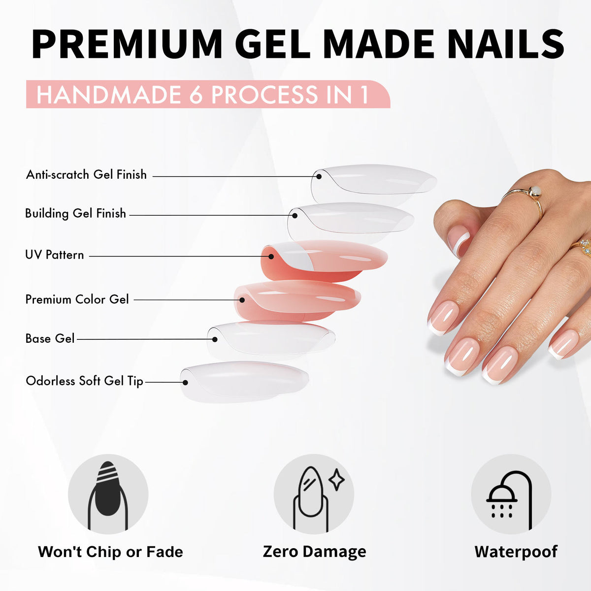 Made by Soft Gel: SHANGMENG®Nail created these acrylic press on nails entirely through a handmade 6-layer process (soft gel tip, base gel, color gel, pattern, double-layer gel finish). The colors and patterns are made with gel polish instead of being printed with ink. You can get our salon-like nails in 5 minutes!!