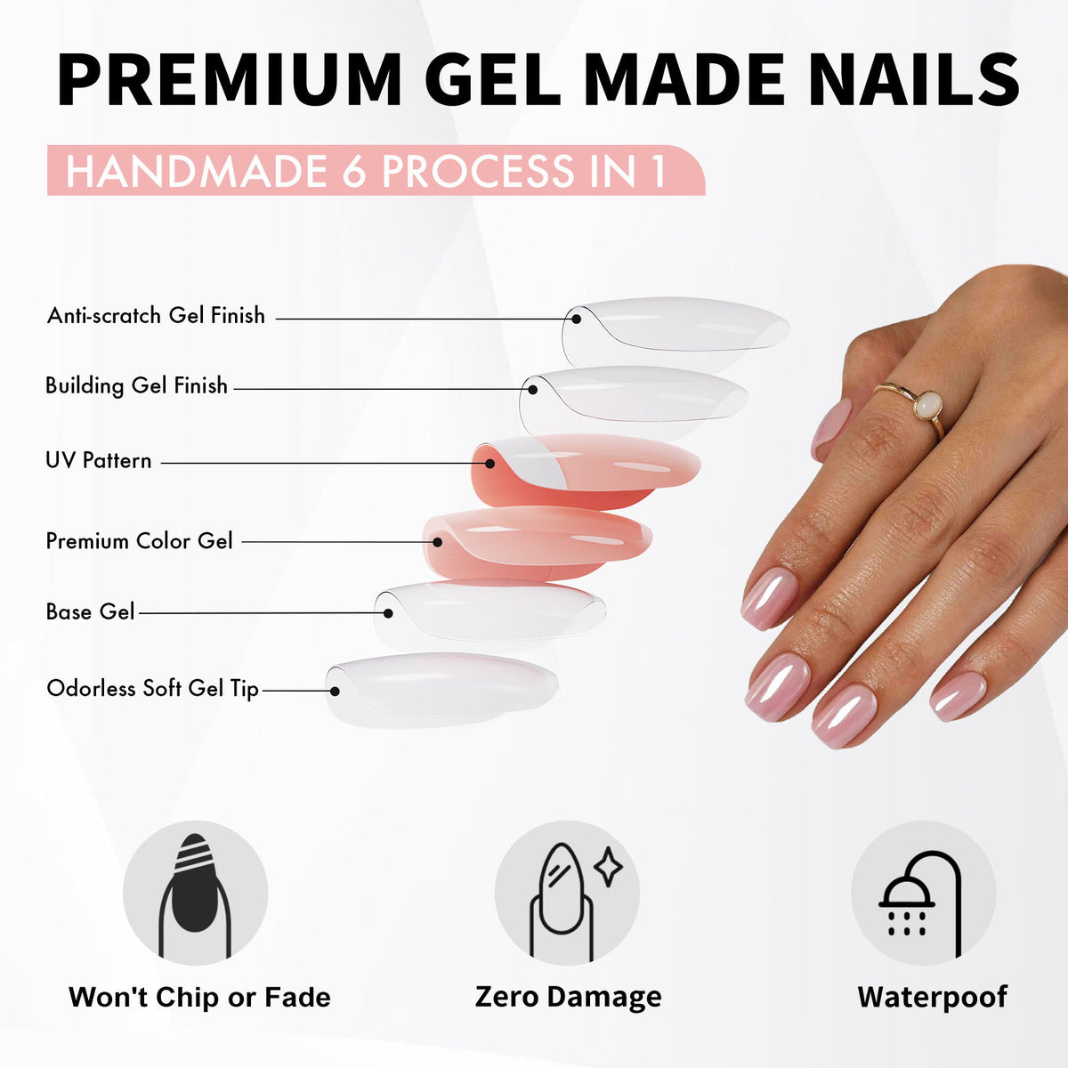 Made by Soft Gel: SHANGMENG®Nail created these acrylic press on nails entirely through a handmade 6-layer process (soft gel tip, base gel, color gel, pattern, double-layer gel finish). The colors and patterns are made with gel polish instead of being printed with ink. You can get our salon-like nails in 5 minutes!!