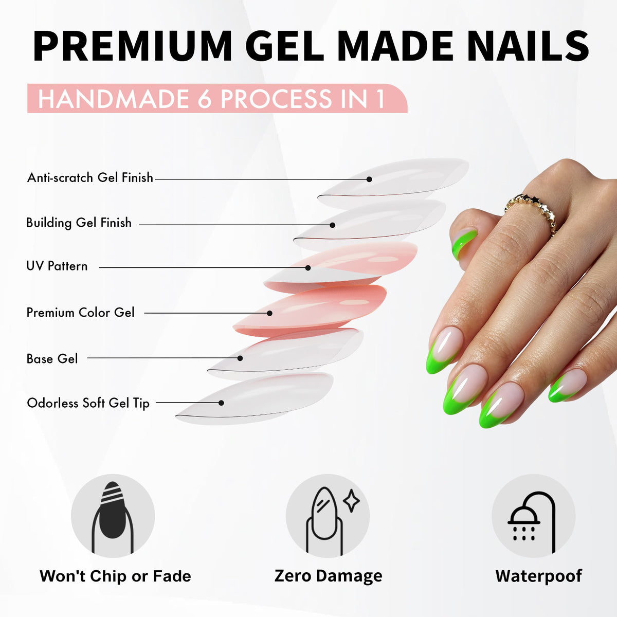 Made by Soft Gel: SHANGMENG®Nail created these acrylic press on nails entirely through a handmade 6-layer process (soft gel tip, base gel, color gel, pattern, double-layer gel finish). The colors and patterns are made with gel polish instead of being printed with ink. You can get our salon-like nails in 5 minutes!!