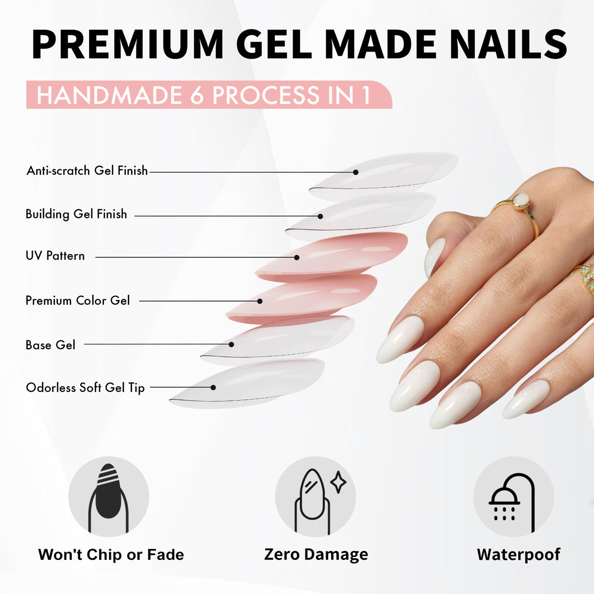 Made by Soft Gel: SHANGMENG®Nail created these acrylic press on nails entirely through a handmade 6-layer process (soft gel tip, base gel, color gel, pattern, double-layer gel finish). The colors and patterns are made with gel polish instead of being printed with ink. You can get our salon-like nails in 5 minutes!!
