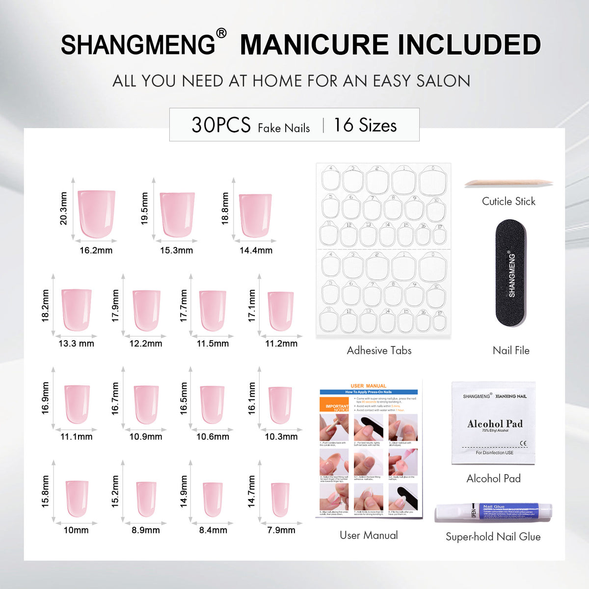 The great thing about SHANGMENG® nails is that they are available in many different sizes. Our kits that come with 32 nails include 16 different sizes. You can shape all the nails to your preference so that it fits perfectly. In addition, our nail widths range from 6.2mm to 15.01mm.