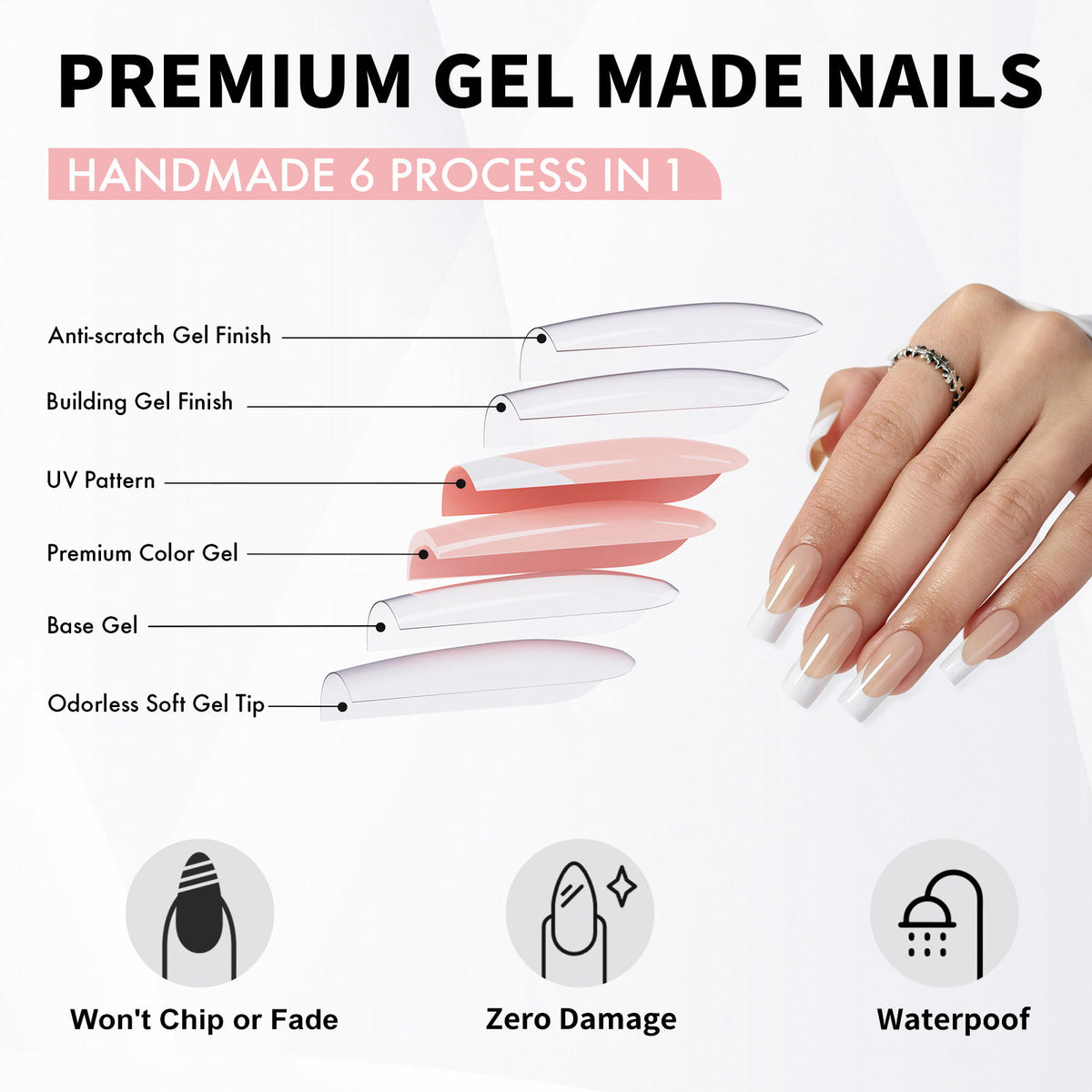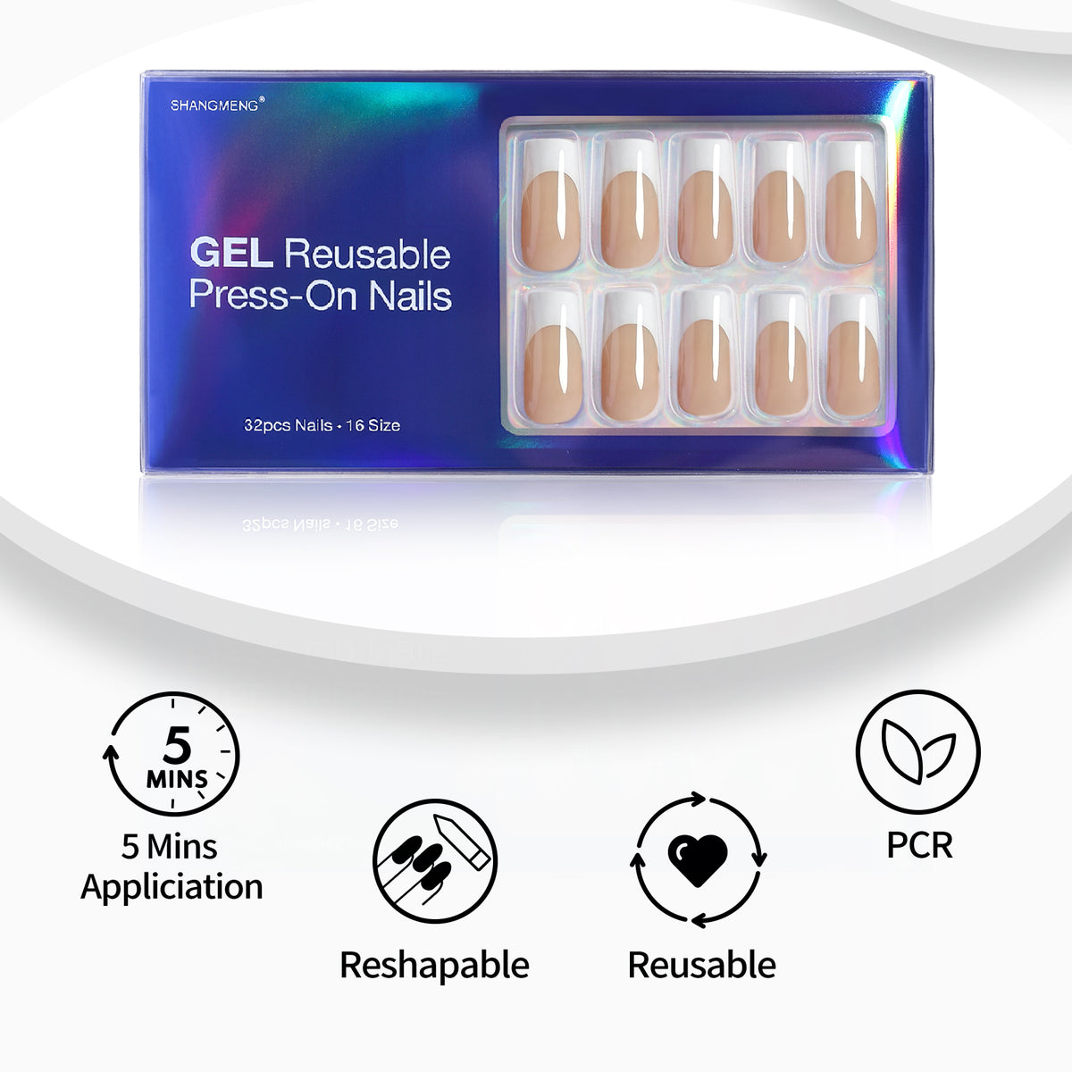 Made by Soft Gel: SHANGMENG®Nail created these acrylic press on nails entirely through a handmade 6-layer process (soft gel tip, base gel, color gel, pattern, double-layer gel finish). The colors and patterns are made with gel polish instead of being printed with ink. You can get our salon-like nails in 5 minutes!!