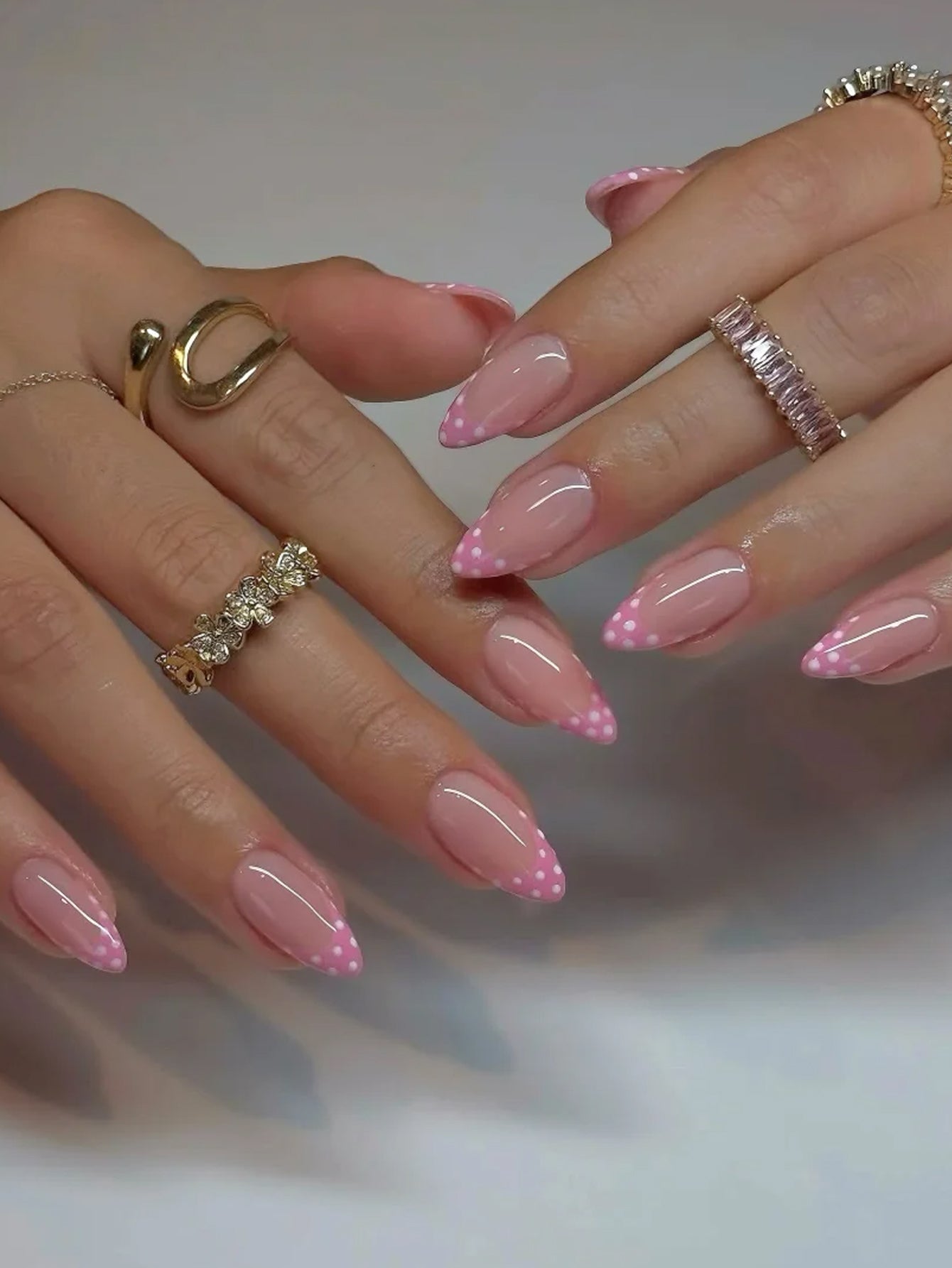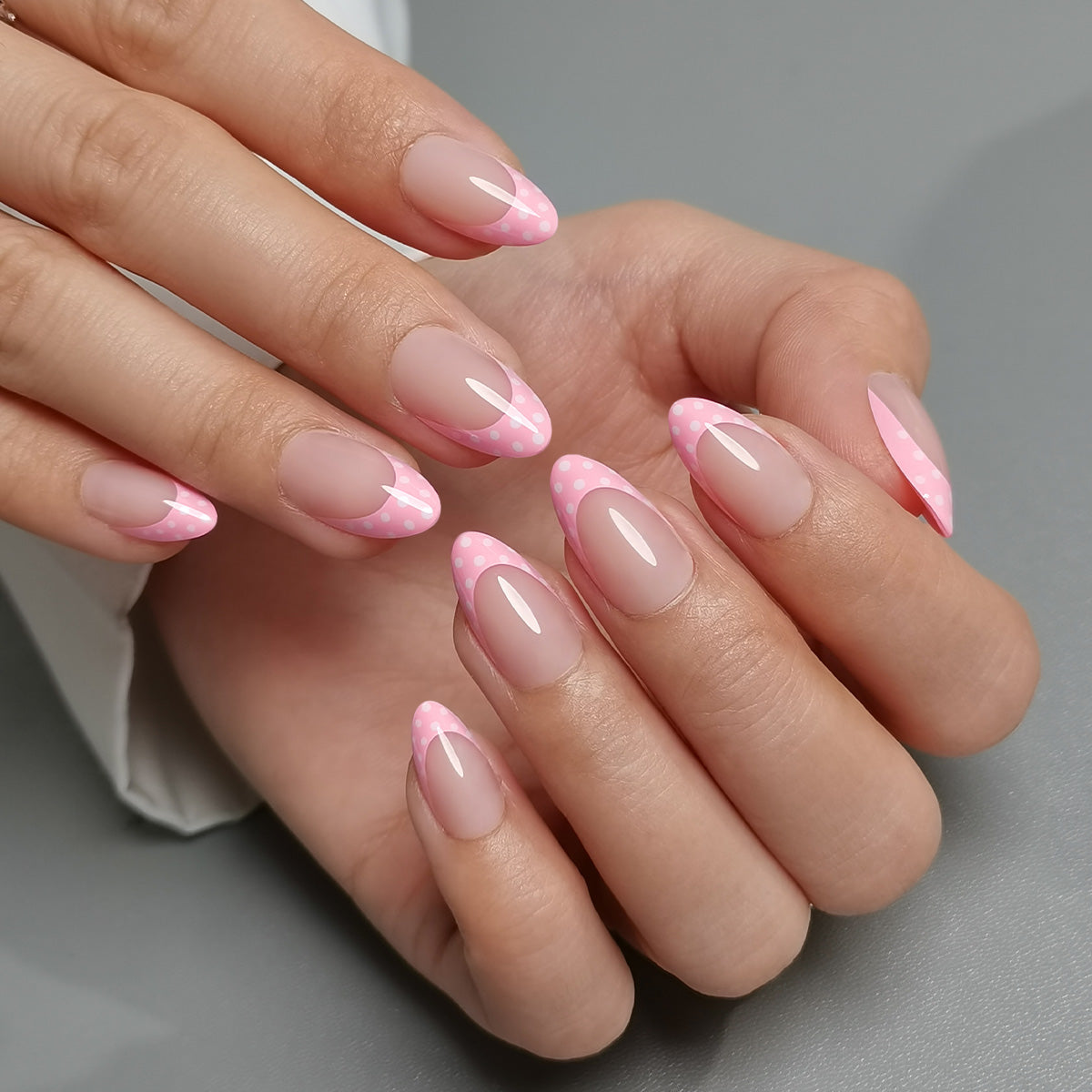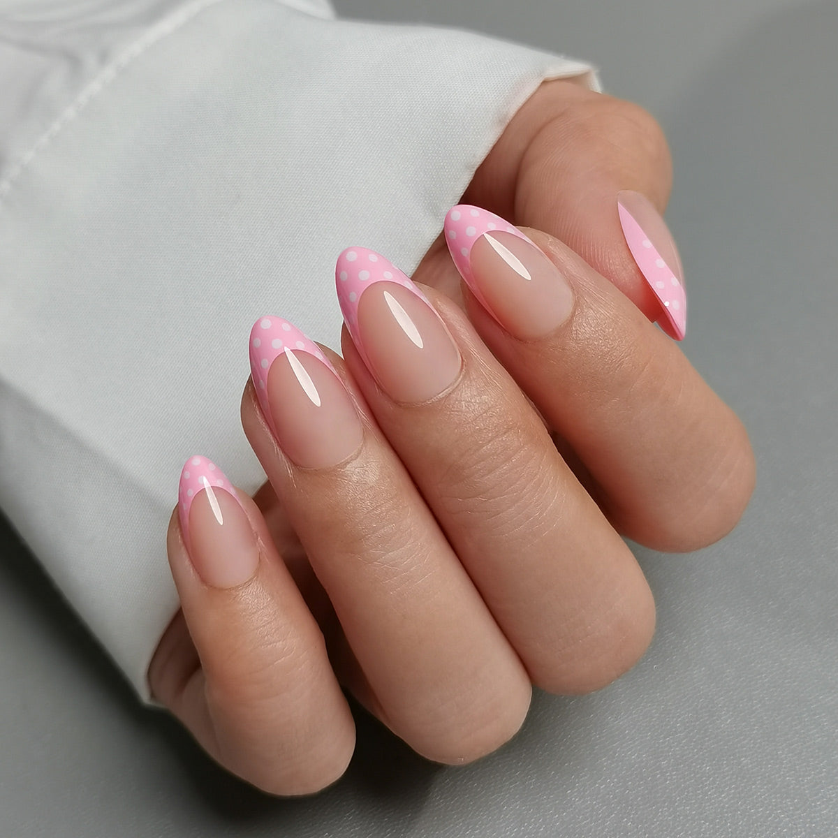 Pink Polka Dot French Tip Almond Gel Nails