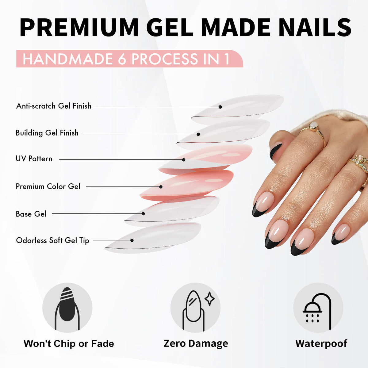 Made by Soft Gel: SHANGMENG®Nail created these acrylic press on nails entirely through a handmade 6-layer process (soft gel tip, base gel, color gel, pattern, double-layer gel finish). The colors and patterns are made with gel polish instead of being printed with ink. You can get our salon-like nails in 5 minutes!!