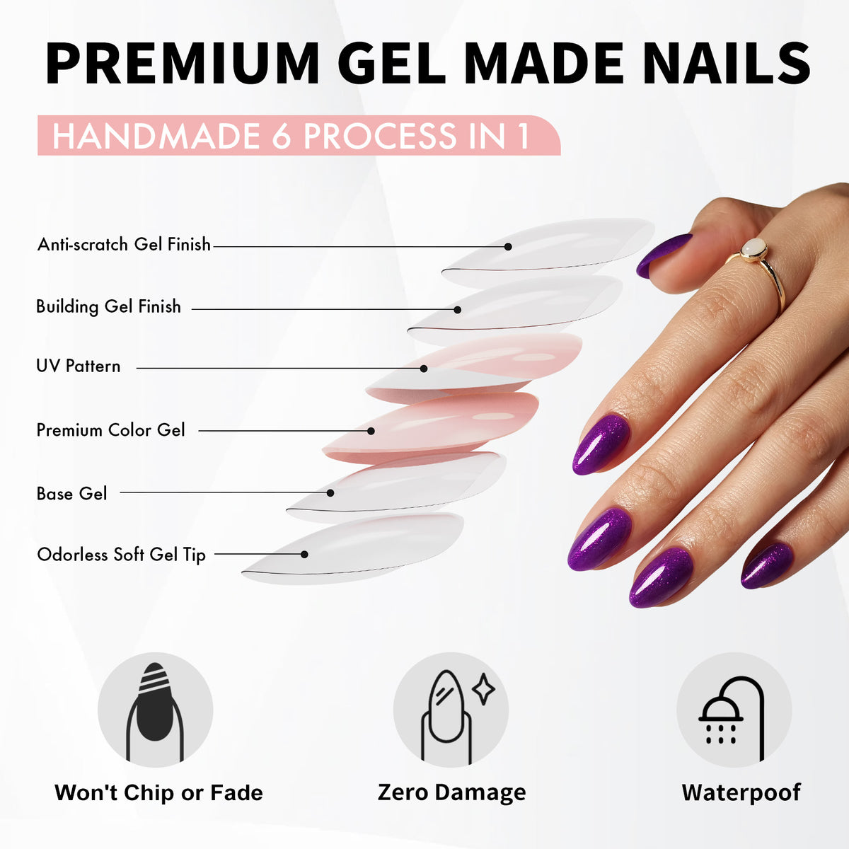 Made by Soft Gel: SHANGMENG®Nail created these acrylic press on nails entirely through a handmade 6-layer process (soft gel tip, base gel, color gel, pattern, double-layer gel finish). The colors and patterns are made with gel polish instead of being printed with ink. You can get our salon-like nails in 5 minutes!!