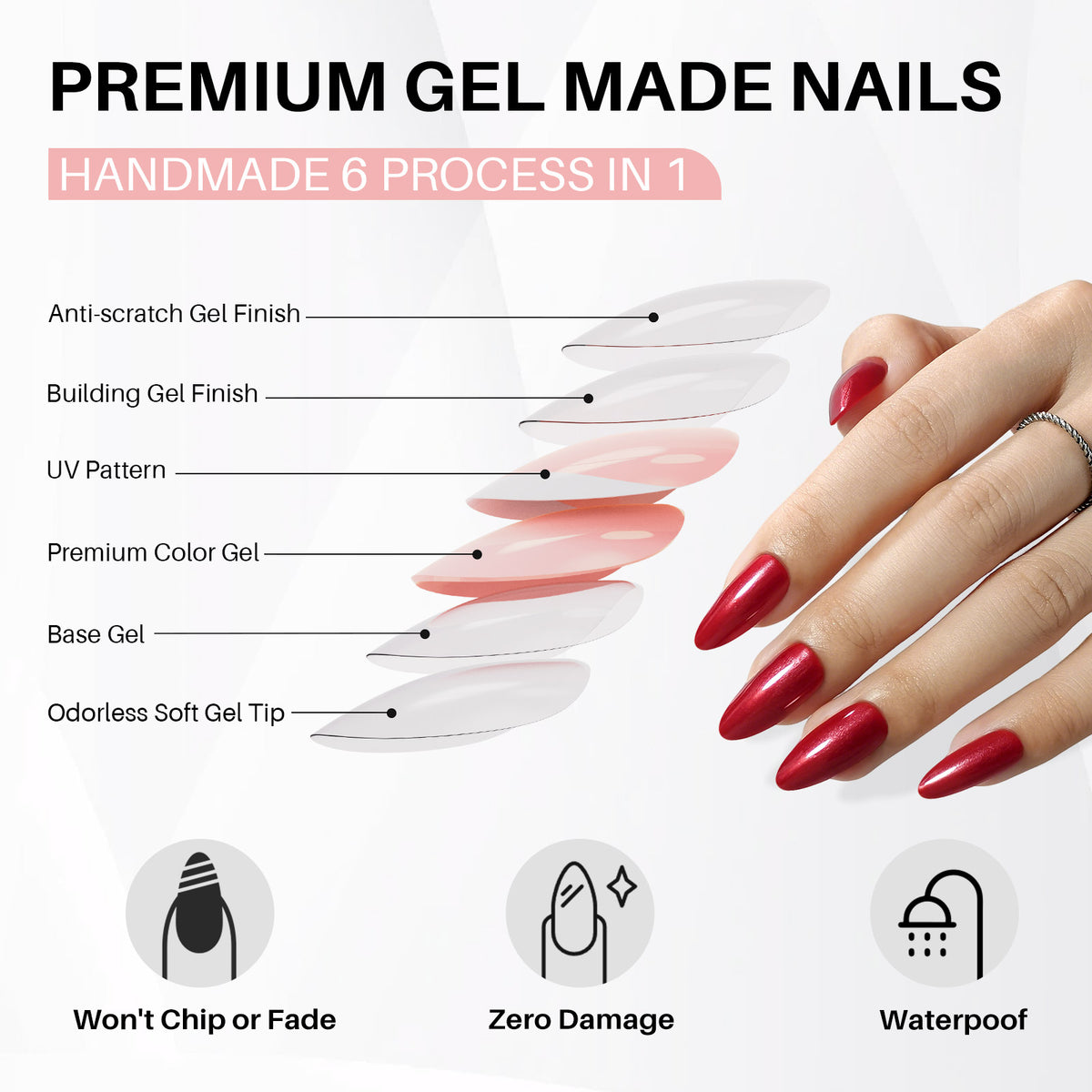 Made by Soft Gel: SHANGMENG®Nail created these acrylic press on nails entirely through a handmade 6-layer process (soft gel tip, base gel, color gel, pattern, double-layer gel finish). The colors and patterns are made with gel polish instead of being printed with ink. You can get our salon-like nails in 5 minutes!!