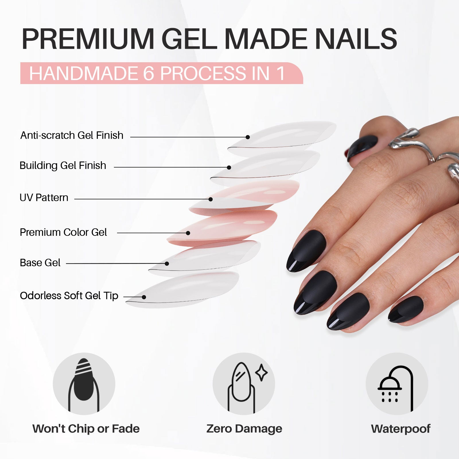 Made by Soft Gel: SHANGMENG®Nail created these acrylic press on nails entirely through a handmade 6-layer process (soft gel tip, base gel, color gel, pattern, double-layer gel finish). The colors and patterns are made with gel polish instead of being printed with ink. You can get our salon-like nails in 5 minutes!!