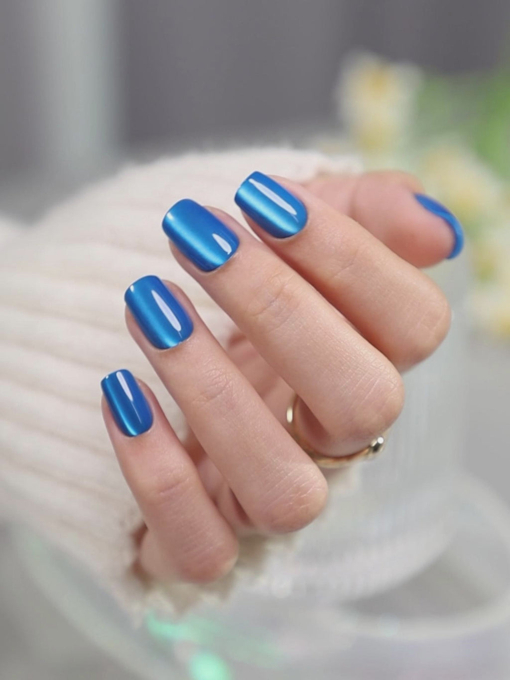 SHANGMENG® Royal Blue Sapphire Cat Eye Short Square Soft Gel Press-on Nails