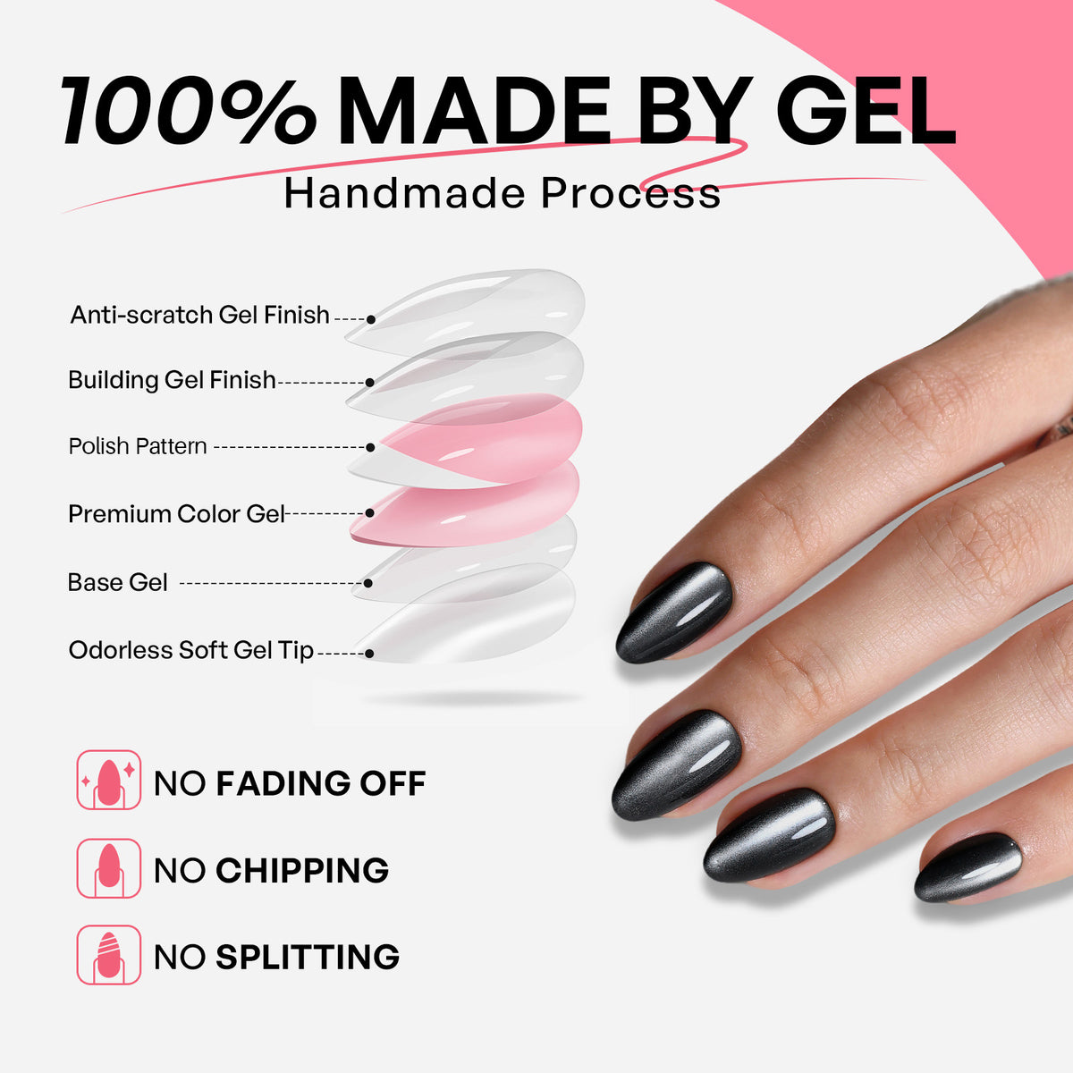 Made by Soft Gel: SHANGMENG®Nail created these acrylic press on nails entirely through a handmade 6-layer process (soft gel tip, base gel, color gel, pattern, double-layer gel finish). The colors and patterns are made with gel polish instead of being printed with ink. You can get our salon-like nails in 5 minutes!!
