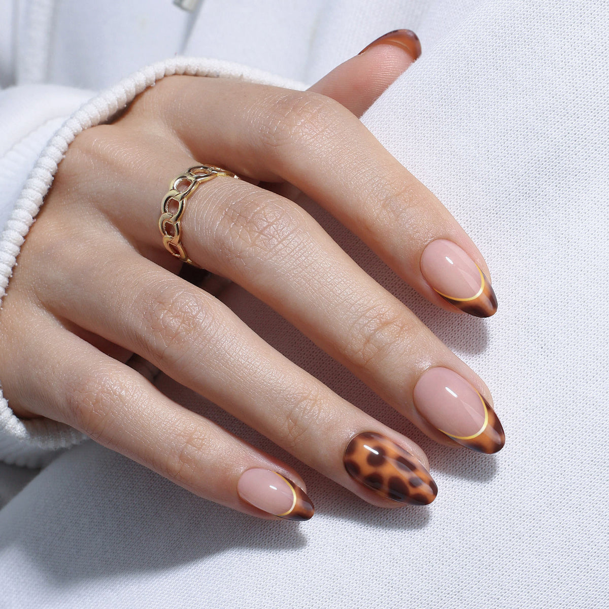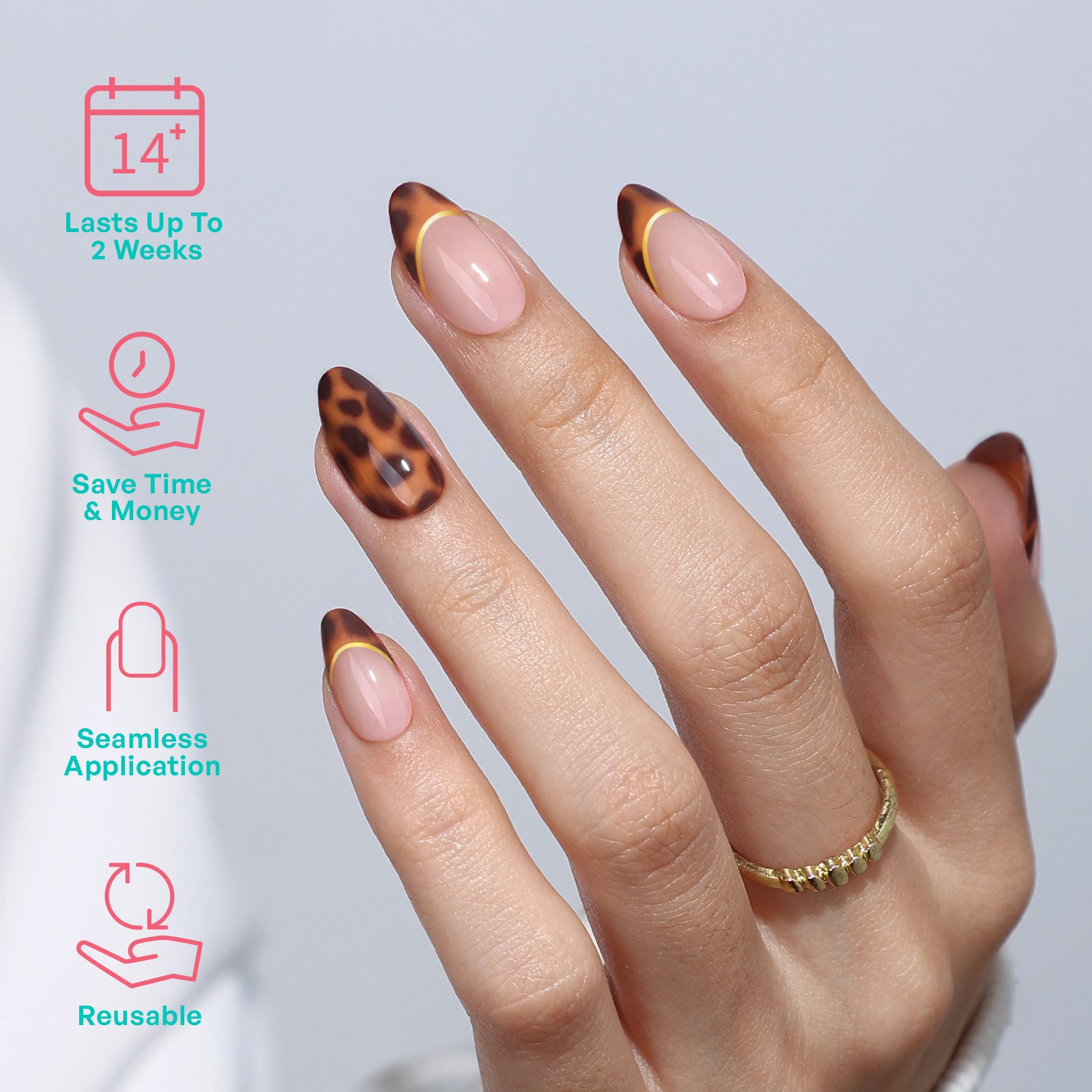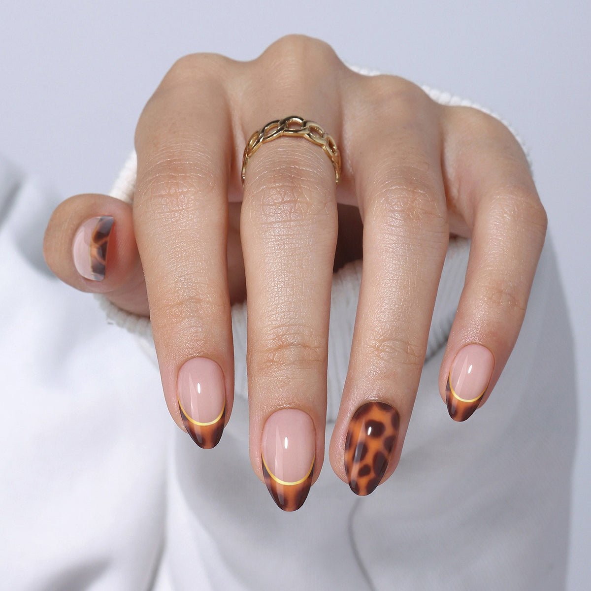• Stylish tortoise shell French tip design with rich caramel and amber tones