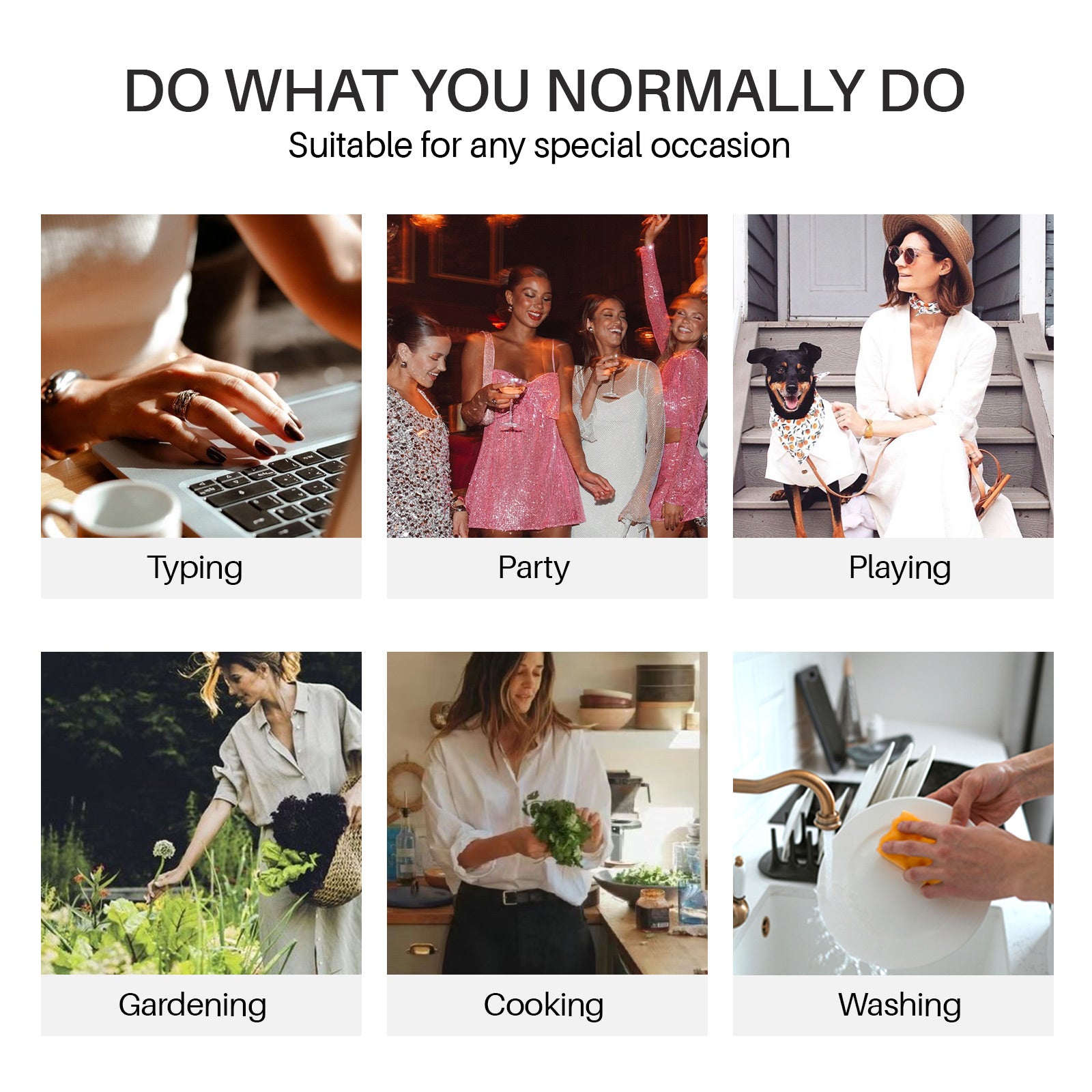• Do Everything You Normally Do, from keyboards to gardening to the kitchen, waterproof, no pop-off, all glam.