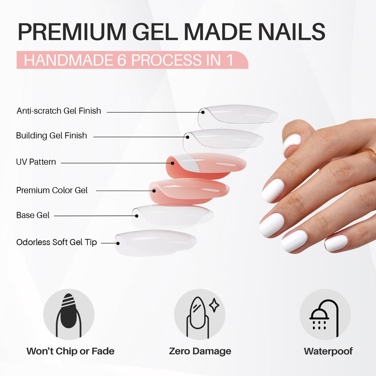 Made by Soft Gel: SHANGMENG®Nail created these acrylic press on nails entirely through a handmade 6-layer process (soft gel tip, base gel, color gel, pattern, double-layer gel finish). The colors and patterns are made with gel polish instead of being printed with ink. You can get our salon-like nails in 5 minutes!!
