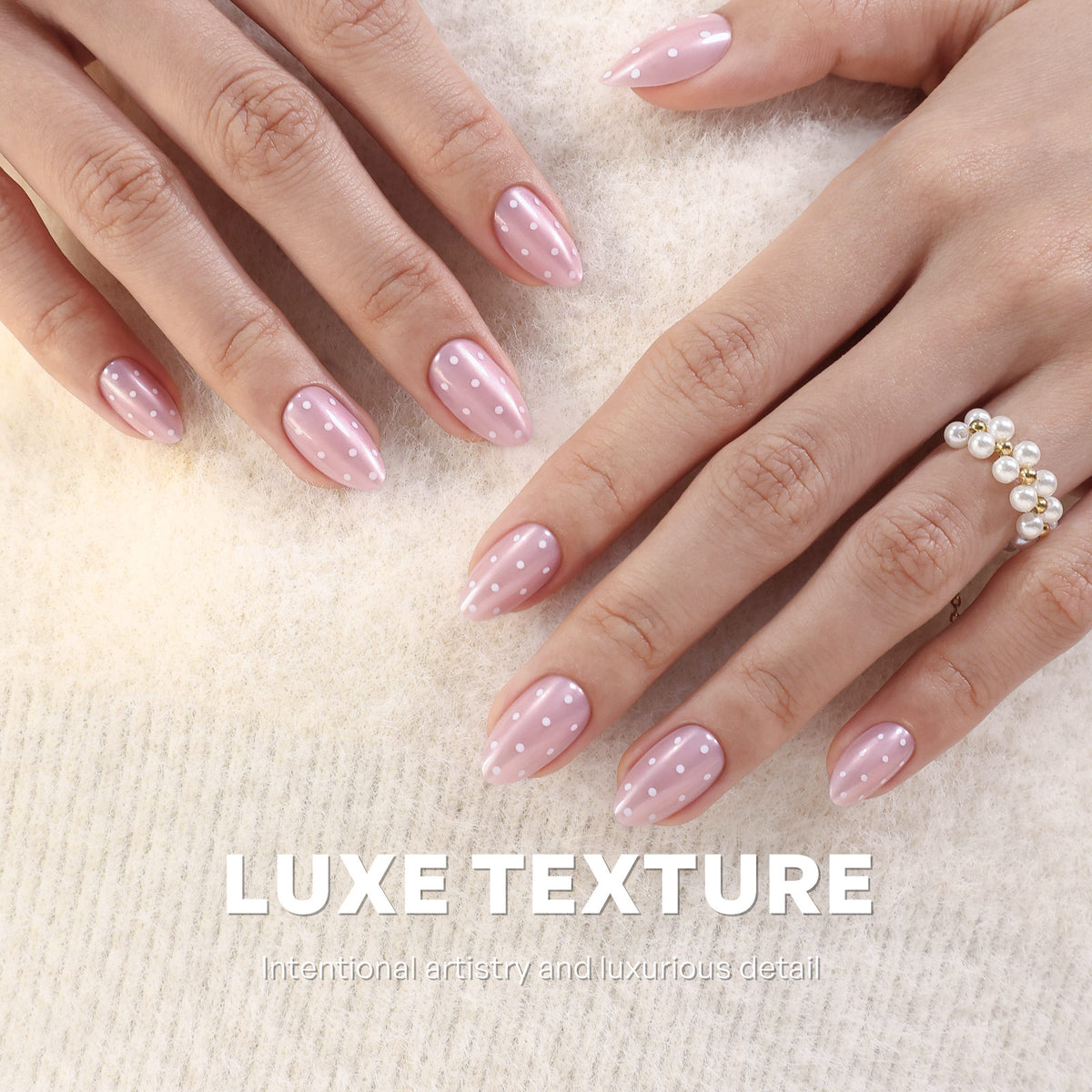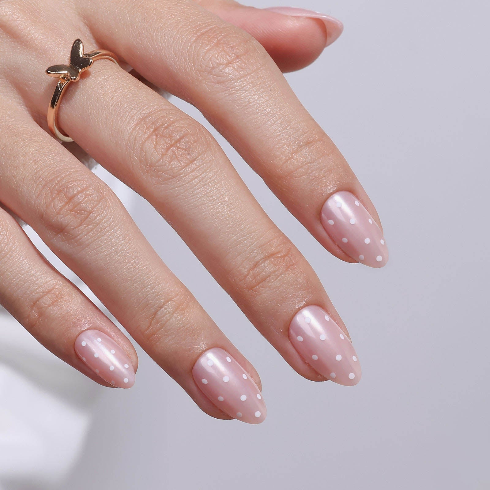 SHANGMENG new trending Press On Nails. Add a playful touch of elegance to your manicure with these Pearly Pink Polka Dots Short Almond Press On Nails. Designed in a soft, pearly pink base with delicate white polka dots, this set perfectly blends cute charm with a polished, feminine finish. The subtle shimmer of the pearly pink creates a fresh, luminous look—ideal for everyday wear or sweet, stylish moments.