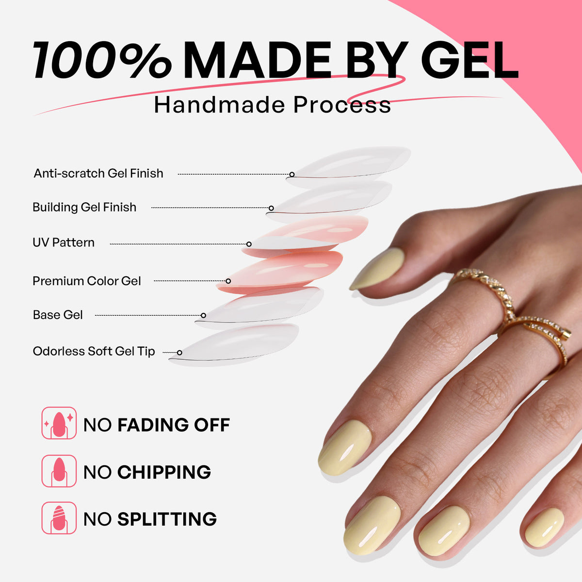 Made by Soft Gel: SHANGMENG®Nail created these acrylic press on nails entirely through a handmade 6-layer process (soft gel tip, base gel, color gel, pattern, double-layer gel finish). The colors and patterns are made with gel polish instead of being printed with ink. You can get our salon-like nails in 5 minutes!!